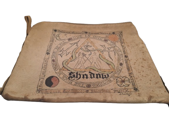The cloth's hand-drawn style aligns with Herron's era and aesthetic. As a bizarre magick performer, he created custom props and "talismans" for shows—e.g., gothic-script inscriptions like "ONE IS ALL" mirror his storytelling credos on unity and shadow/light duality. The symbols (Ouroboros, All-Seeing Eye, Yin-Yang) are staples in bizarre magick, used for atmospheric effects rather than literal evocation.
