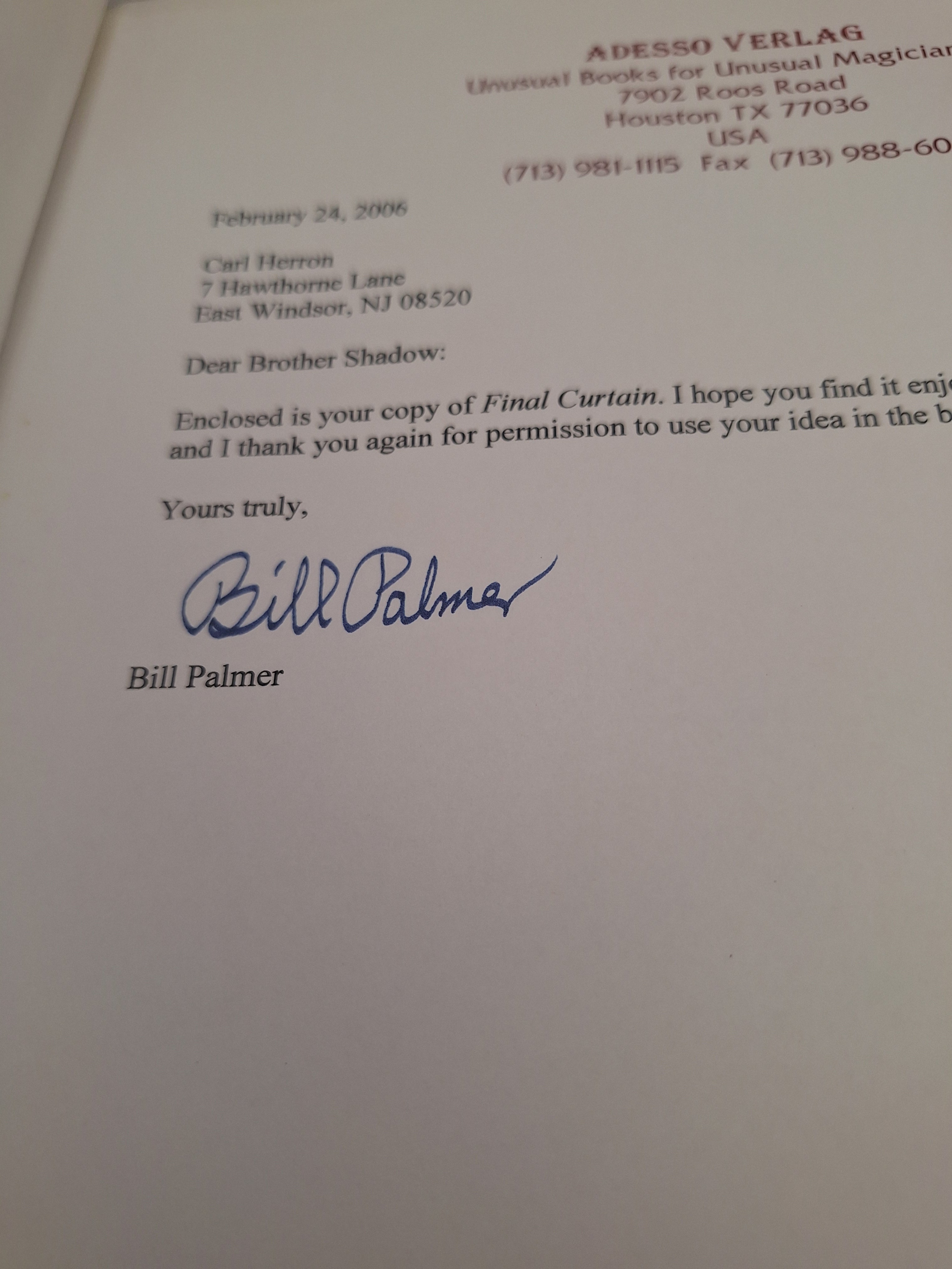 Signed by Bill Palmer.