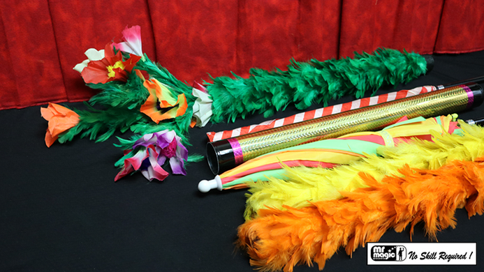 You place a plume inside a decorated tube. Even though the tube was previously shown empty, when the plume is pulled out, it has changed into a beautiful bouquet of flowers! A blue plume changes to yellow. An orange plume changes into a red and white flag. A red plume turns orange. A green plume turns into an umbrella! Each time a plume is placed inside the tube, it comes out either colored differently, or as a completely different item. Wow!