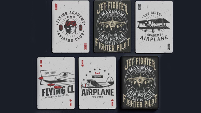 Jet Fighter Playing Cards feature a vintage-style Aviation-themed design celebrating aviation and fighter pilots, with the slogan "The Sky Is Yours", "Fighter Pilot" on the tuck box. The Joker card in the deck also follows this theme, displaying a "Flying Academy Aviator Club" design.