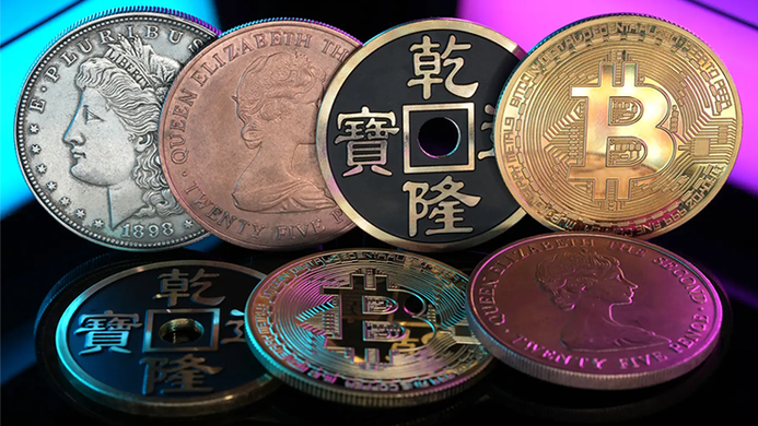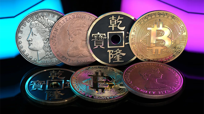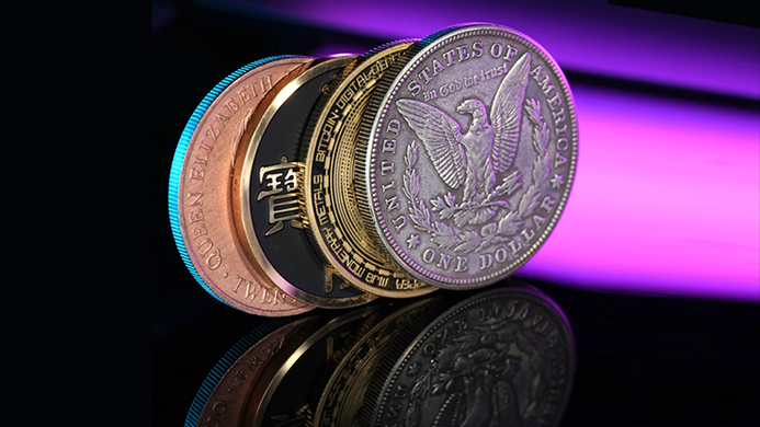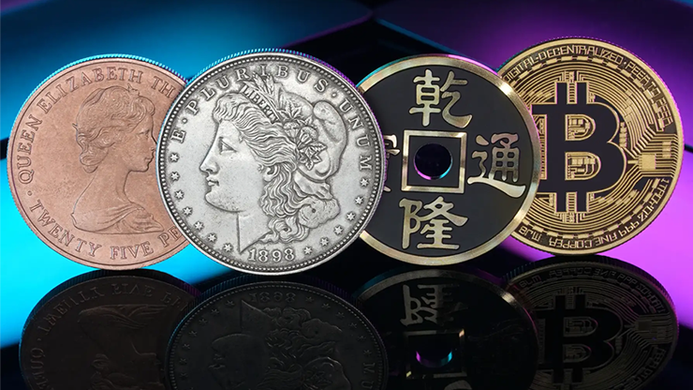 - Includes Morgan Dollar, Copper Coin, Ancient Coin, and Bitcoin