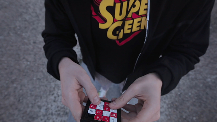 An instantly recognizable number puzzle game is handed to a spectator to mix up. The magician then "memorizes" the position of the numbers and turns the puzzle face down as he attempts to solve it without looking. Despite there being almost 20 trillion different combinations, the magician is able to solve the puzzle.