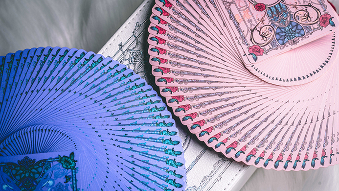 We released this fancy set for Magpie Festival. The pearly-lustre leather box contains a blue and a pink deck and comes with a rose brooch. We used rose scented ink for the first time, so it smells floral. The number of each blue deck is 1314/1314, representing "lifelong"; Each pair of pink decks is numbered 520/520, representing 'I love you'.