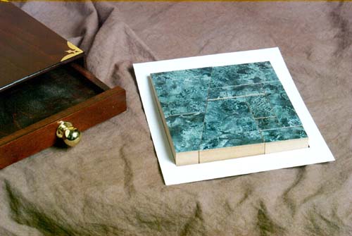 Effect: Pete Biro removes 10 marbled blocks of wood from a beautifully decorated hardwood box. The pieces form a rectangle 14 by 12 cm, around which a white frame fits exactly - a puzzle. Pete tells the crowd that in addition to purchasing this beautiful puzzle box, he also purchased an expensive potion (in which he then displays a small bottle containing liquid), at a much higher sum then the puzzle box. Joe Stevens at Stevens Magic assured me that it was the original elixir, which Merlin, himself concocted. Without the elixir no one could ever figure out the puzzle. Just for fun, Pete decides to try and solve the puzzle without using the potion - and to his amazement and disappointment, he is able to do it without using so much of a dram of the magical elixir! Pete, thinking realizing how much he spent of the special potion, immediately runs back to Stevens Magic to lay into Joe for selling him expensive elixir that he didn't even need! Joe greets Pete and says, 'Please calm down! I forgot to give you one of the pieces of the puzzle!'