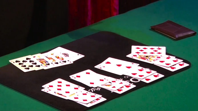 Then the face up Royal Flush cards are cut in the middle of the pile and the cards are dealt again in five poker hands. This time in each poker hands lands face up one of the Royal Flush cards among the other four face down cards. After the poker hands are turned except the performer hand, is clearly visible that while in each turned piles there are four face up cards and one of the Royal Flush cards face down, in the performer hand are four face down cards and a Royal Flush card face up.