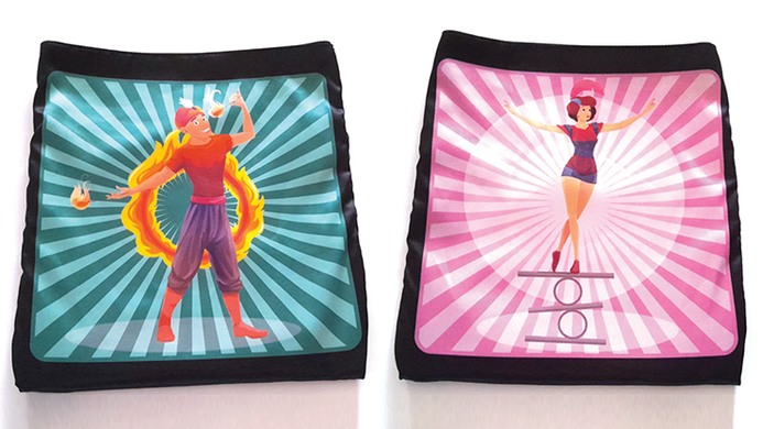 Brightly colored custom printed fabric featuring 6 different circus performers: