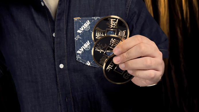 You grab three ancient Chinese coins from the air and then let them disappear into the air one by one.