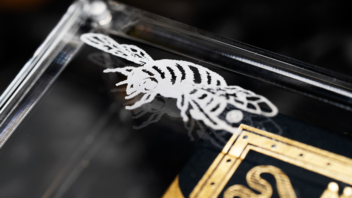 Black and Gold cold foil with numbered custom seals. Set inside an etched carat case (not sold individually).