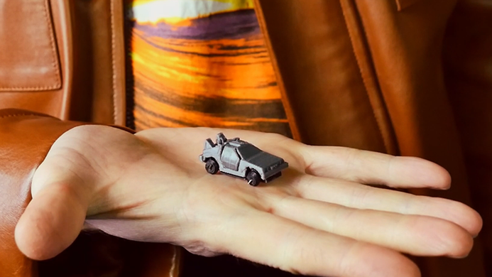 Then the artist shows a time machine that, represented by the Delorean car, will slide through the cards looking for the memory hidden in time.