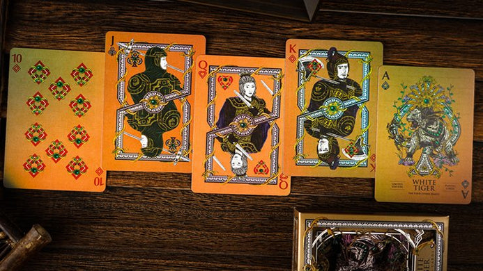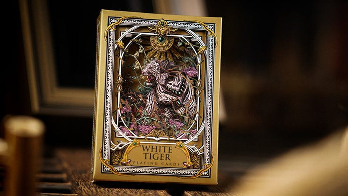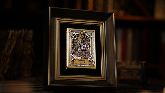 In the Titanium Gold Limited Edition of the White Tiger, the playing cards continue the vibrant colors of the solid wood box, featuring colorful foil stamping. The background color has been changed from purple to a mysterious and dignified coffee and titanium gold.