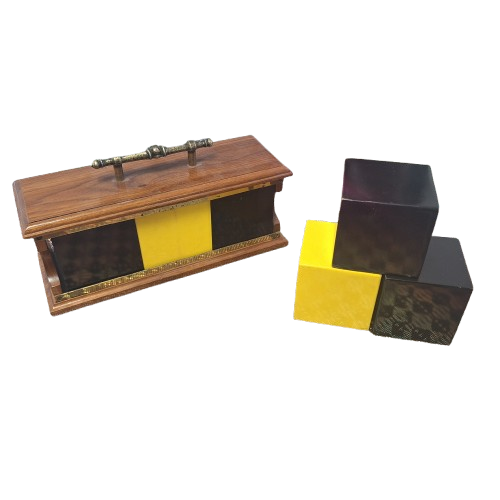 Good condition. Blocks are slightly worn from use. Small fleck of the metal has been worn with instructions. SEE PHOTOS FOR CONDITION.