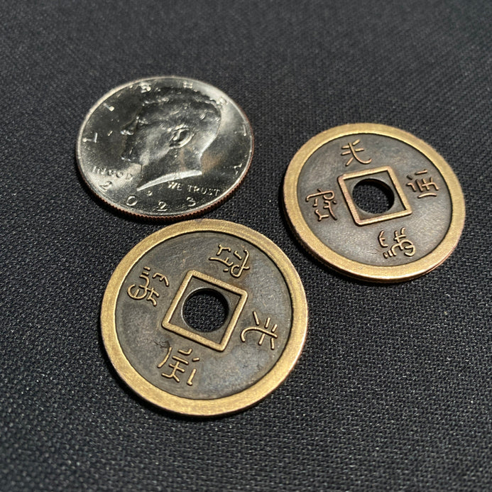 Effect: You show two coins to a spectator, a Chinese coin with a hole in it and a half dollar. You start a very simple game with the participant in which they will try to follow the location of the 2 pieces. As you visually drop the silver coin into their hand and keep the one with the hole in yours. Magically somehow the two coins swap with the snap of your fingers! You are not dreaming, in a fraction of a second, the participant finds himself with the Chinese coin in his own hand - even though they never opened their fist!