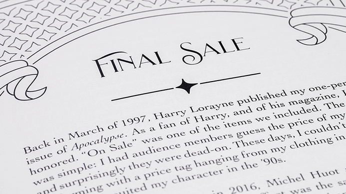 "Even seasoned performers will find a great amount of valuable information within these pages. The author explains much more than the mere mechanics of the tricks. He goes into the details that make his material work in the real world, from managing the props to how the tricks play in relation to the routines before and after...I had the privilege of using "Name-Dropper" before it was published, and it instantly became one of my show's highlights. You can easily create an entire show from the material in this book, with tricks like "Final Sale," where a random audience member guesses the cost of your jacket; another favorite is "Now and Later," an effect where you appear to lasso a randomly chosen playing card. I find the method to be as beautiful as the effect."