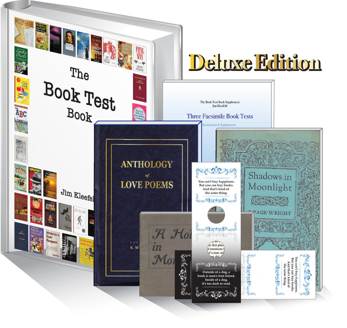 Deluxe Edition is signed and numbered and comes with those value added extras that make it so much sweeter. The Deluxe Edition is signed and numbered and comes packaged with three facsimile book tests from the 1930s (one hardcover and two softcover), two Hubert Brill Word-O Book Test gimmicks, a The Book Test Book bookmark, and an exclusive imprinted ribbon bookmark.