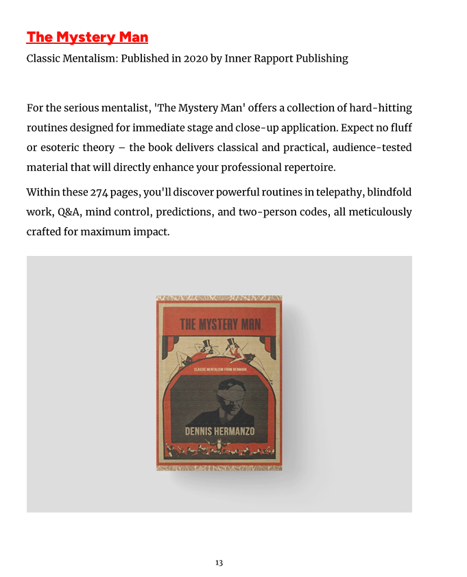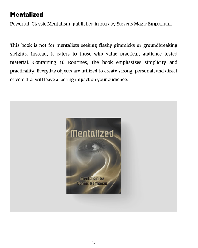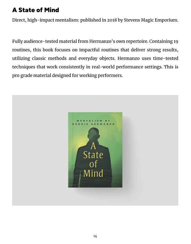 Explore 27 powerful effects, from stage illusions to close-up miracles, and then delve into the explanations behind the mysteries. Along with seven essays from Dennis Hermanzo on the art and acts of mentalism, makes The Psychic Town an essential addition to any performer's library.