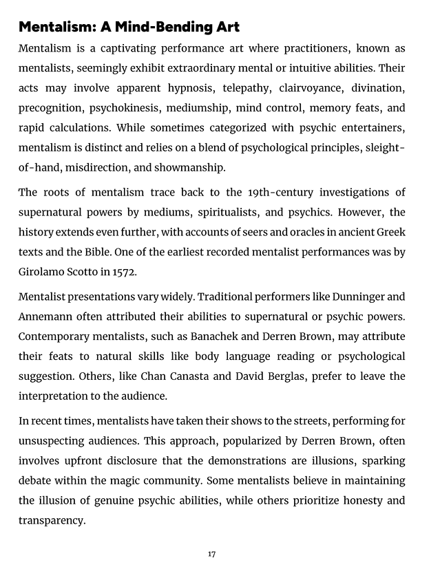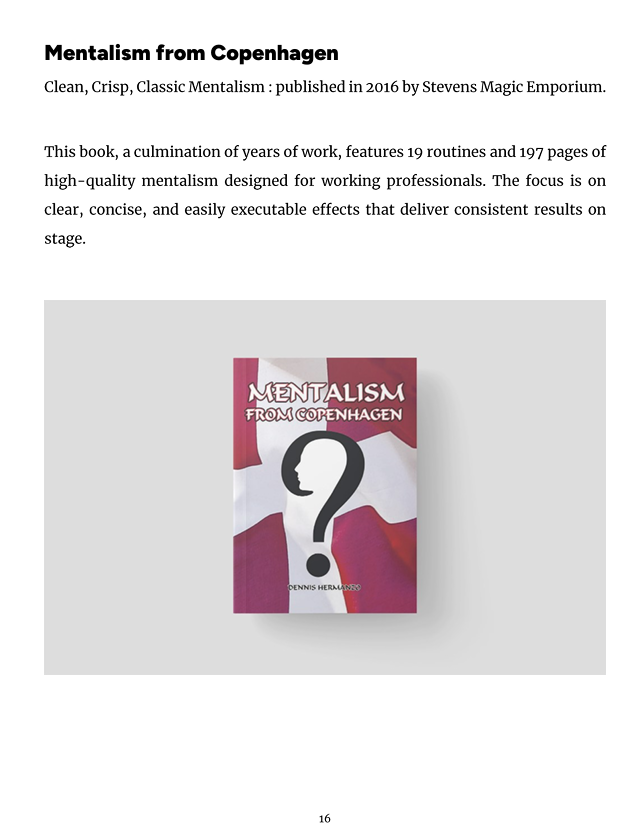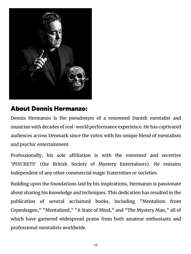 Denise Manzo, a skeptical Danish journalist, is tasked with uncovering the truth behind Copenhagen's mystical and psychic reputation. As she delves deeper into the city's underground she encounters a captivating cast of characters, each with their own unique psychic abilities. Each chapter unveils a new mentalism routine, seamlessly integrated into the narrative.