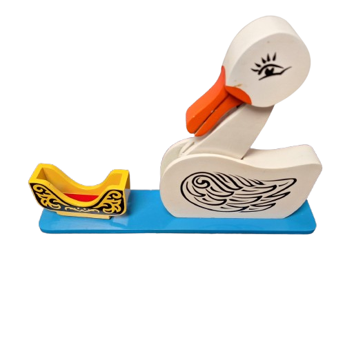 The Educated Duck is a mechanical wooden duck, which picks out selected cards from a shuffled deck, placed in its feed box.. This is an excellent comedy prop, and to enhance the entertainment the duck can be “blindfolded” and you can have him choose the wrong card, then remove the blindfold and he will pick out the right card. You can use it for a variety of routines, with alphabet or number cards, picture cards, or even a vent type question answer routine.
