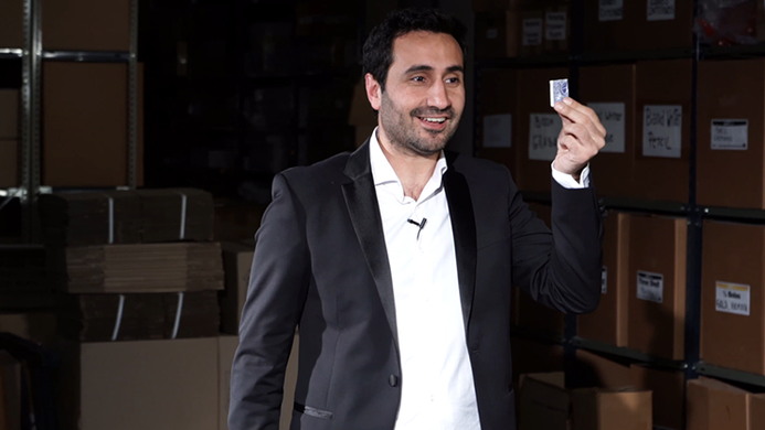 He says: "I've been trying this for years and I always miss," while he shows a transparent bag full of folded cards. After the laughs he says: "It's very hard to divine a card, but it's harder to catch a thought."