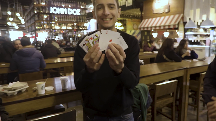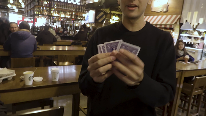 The startling classic card index routine! A deck it's shuffled and you place one half in each pocket. Then, you start producing freely named cards, as many as you want. As a finale you produce any called poker hand.