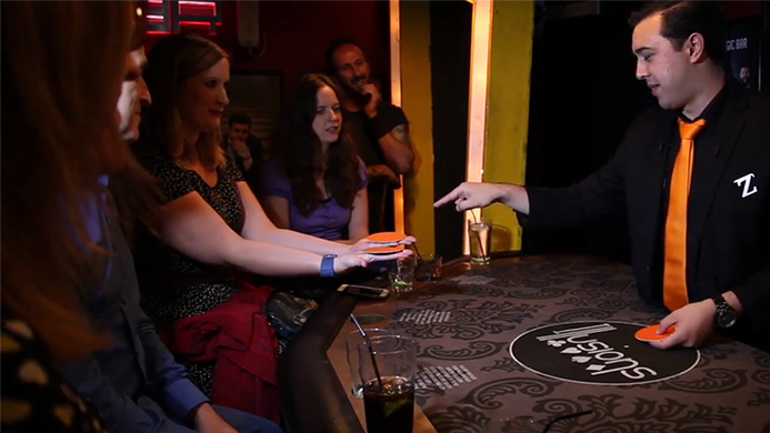 The serial number of a borrowed bill is written on a coaster. This bill vanishes magically. After a guessing game with the coasters, the bill appears inside the coaster with its serial number written on it. Andi Gladwin wrote: "It's an almost-impromptu trick that is perfect for bar magicians or impromptu performances."