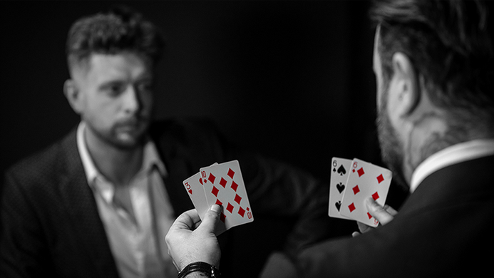 In the first phase, two hands of Blackjack are created by kept face down. The spectator chooses which hands they wants... and you win. In the second phase, a card of each Blackjack hand is shown and still...you are left with the winning hand. In the third phase all the cards are shown except one... and still you win. In the last phase ALL the cards are shown, and still you mysteriously win.