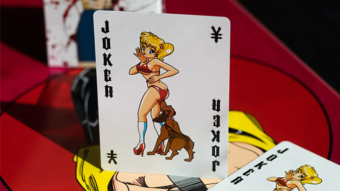Printed in China on cardistry stock with metallic red hot foil stamping on the card back and the tuck box.