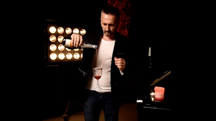 The glass moves up and down while a stream of champagne is pouring into it.