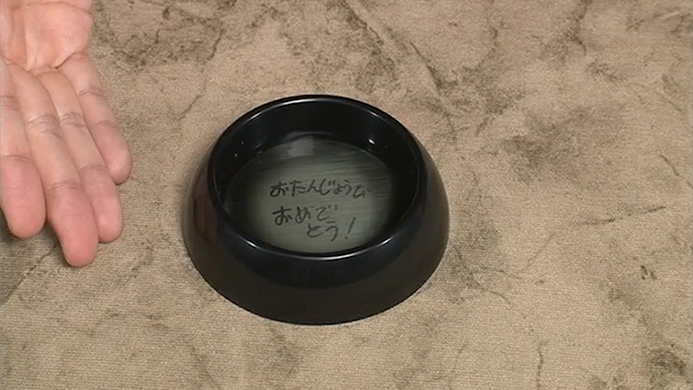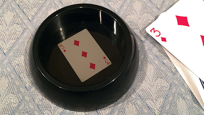 The magician pours water into a container, and asks the spectator to concentrate on her card as she gazes at the water surface.