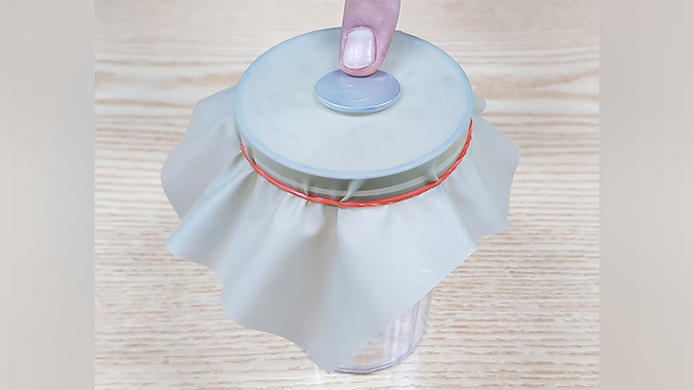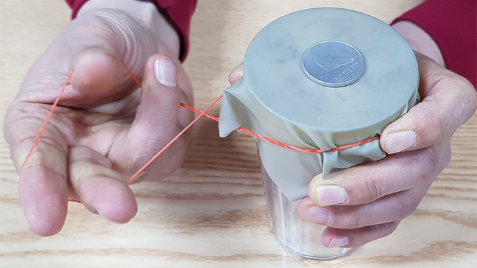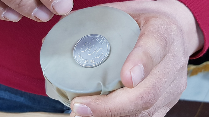 A magician will use a cup with the top covered by a rubber sheet, you can put a coin (quarter) on top of the rubber sheet and has a spectator push down on the coin, with a second the coin falls right through the rubber sheet inside the cup. Immediately, you can hand everything out for examination.