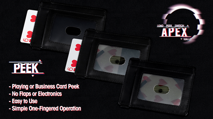 SWITCH - Boasting TWO switching compartments, the Apex wallet allows for incredible visual switches of FULL SIZE playing cards, cash, coins, receipts, or any similarly sized large items. Combine this switch function with a card-load and the possibilities are limitless: blank card to signed card... torn and restored... the list goes on. And the best bit? The main switcher section is auto magnetic- locking which means spectators can open the wallet themselves.