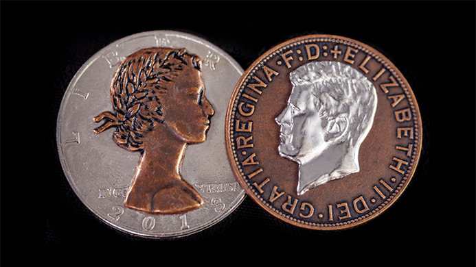 The magician holds the Silver Dollar at fingertips and gives a quick wave of his hand. The silver Head of JFK now changes into the copper head of Queen Elizabeth ii. The rest of the coin is still silver.... Only the head has changed.