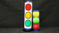 Three balls resembling the colors of traffic signal lights are placed in a cylinder one by one. When the cylinder is removed, the balls are seen jumped from one position to another!