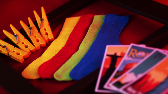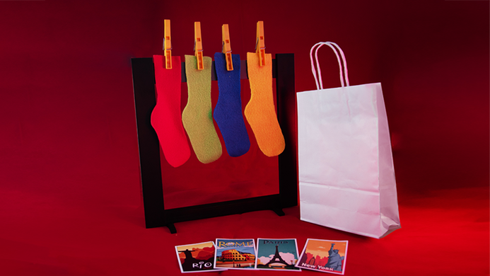 The magician shows a frame with 4 different colored socks hanging on it with clothespins. He shows the pairs of those 4 socks and places them in a paper bag. A spectator chooses one sock at random without the magician seeing it.