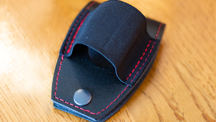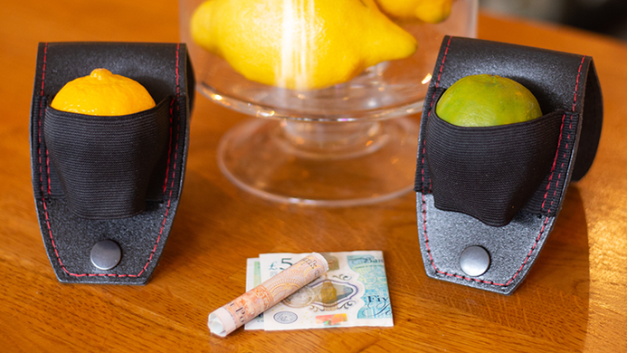 Pro Show Holder holds a shot glass, fruit, beer bottle, pool ball, deck of cards, etc. Loop for belt with press stud, or it can just hang on waist band or back.