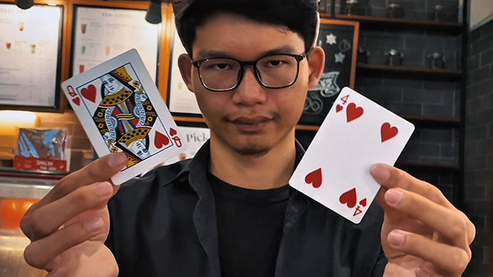 A single Queen of Hearts is displayed clearly and openly. With just a flick or a wave, it visually transforms into the Four of Hearts - no cover, no suspicious moves, just pure visual magic.