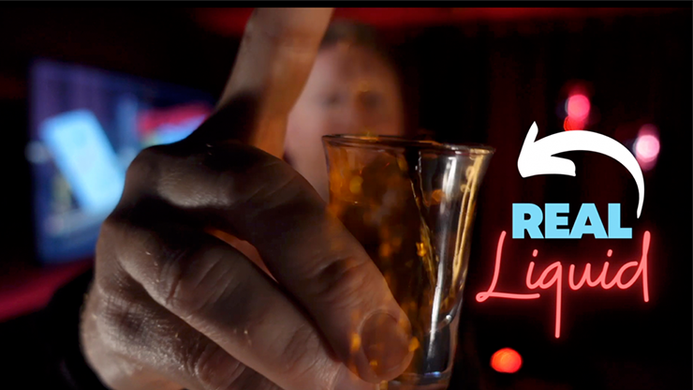 Just when the audience applause has died down the performer reaches into the bag and produces a large shot glass filled to the brim with liquid!
