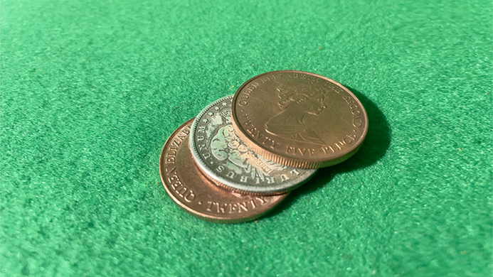 A silver coin is placed between two copper coins and repeatedly vanishes without a trace. With the set of coins you can do this routine and many more effects, transpositions, incredible color changes ... more than an hour of tutorial where Mario explains how everything, in great detail.
