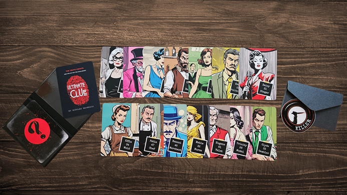 Complete with 14 suspect cards, a gimmicked wallet, prediction cards, an envelope, and a sticker.
