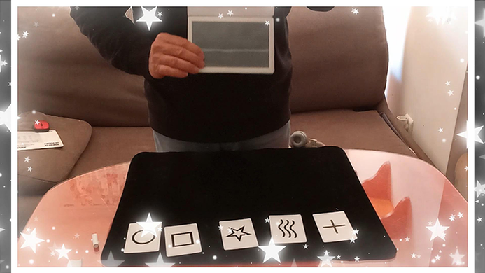 The spectator thinks of a Zener symbol, the magician turns his back and scribes something on a little home made blackboard.