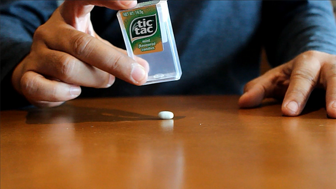 Imagine the following. Show a Tic Tac mint and put it on a table or on your spectator's palm. Slap the Tic Tac box onto the mint and, VISUALLY, with no cover, the Tic Tac mint immediately penetrates the box and can be seen inside! Welcome to Minthru.