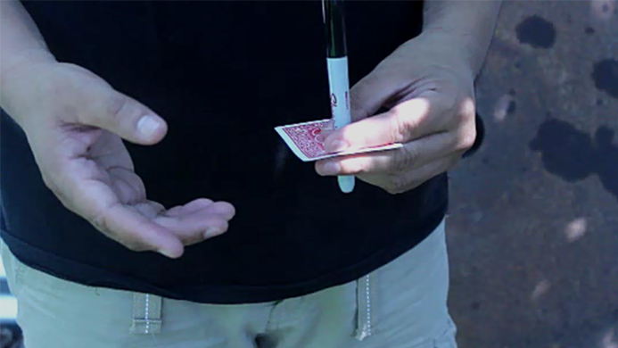 The magician shows a card that has a small hole punched in it. He explains that the Sharpie can't pass through because the hole is too small. But because you are a magician, the Sharpie nevertheless penetrates that small hole - by magic!
