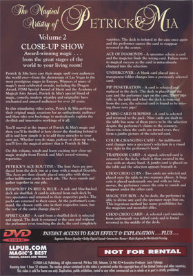 Petrick & Mia have cast their magic spell over audiences the world over-from the showrooms of Las Vegas to the most prestigious stages in Europe. Winners of many of magic's most celebrated awards, including the Dragon Award, FISM Special Award of Merit and the Academy of Magical Arts Award, Petrick & Mia's special blend of magic, comedy, modern wizardry and originality have enchanted and amazed audiences for over 20 years. In this stimulating video series, Petrick & Mia perform their original magic creations for an enthusiastic audience and then take you backstage to meticulously explain the devilish and innovative workings of it all. You'll marvel at the impact of Petrick & Mia's magic and then you'll be thrilled at how clever the thinking behind it all is and how simple it is to add these miracles to your own act. Whether you do stage, parlour or close-up work, you'll love the magical artistry that is Petrick & Mia.