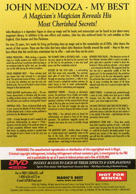 John Mendoza is a legendary figure in close-up magic and his books and manuscripts can be found in just about every magician's library. In addition to his own effects and routines, John has also authored books for such notables as Don England, Chris Kenner and Dan Fleshman. For over 35 years, he's made his living performing close-up magic and in this remarkable set of DVDs, John shares the secrets of that success. These are the tricks that have taken John Mendoza literally around the world - they're the very best effects that this world-class entertainer has to offer - and now they can be yours.