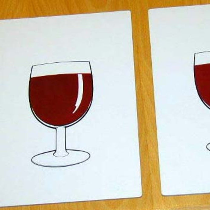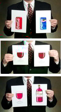 A "magical taste test." The performer shows identical glasses of cola on one side of two large plaques. The opposite sides show a can of Coke and a can of Pepsi. The plaques are slowly mixed. Spectators should be able to keep track of which is which, but every time they guess, they are wrong. Finally, the Pepsi plaque is set aside. The remaining one is Coke, right? No, it is turned over to show a picture of a big bottle of wine! And, when it is turned around again, the brown cola in the glass has changed to wine red! Also in orange juice for children’s shows. Specially gimmicked plaques make it easy to do.