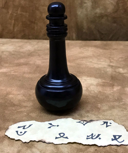 A small wooden bottle sealed with a stopper is removed from a cloth pouch. The Magus relates the manner in which he came by this unusual artifact and the secret it contains. “The bottle actually contains the spirit of a Genie; a wizard from long ago. This tattered parchment tells the tale and the secret to controlling the Genie within this little bottle. It helps us translate the weird and mysterious glyphs on the base of the bottle.”