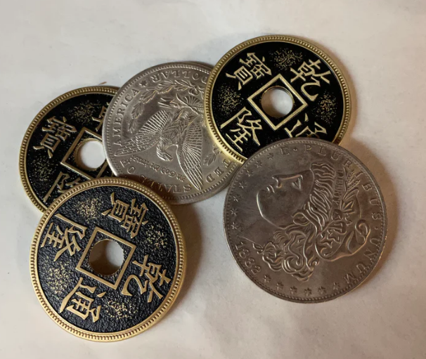 Briefly: Two coins are shown, a Morgan Dollar and an Imperial Chinese coin. One of the coins is dropped into your pocket and it immediately reappears back in your hand.