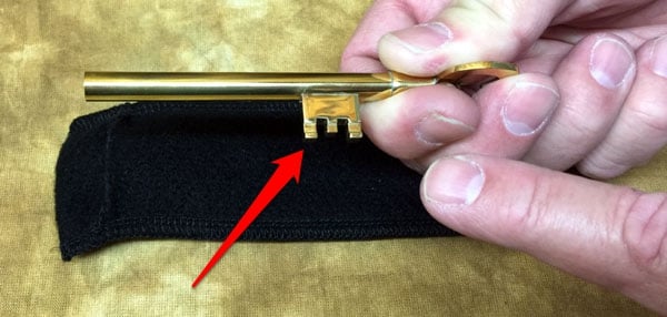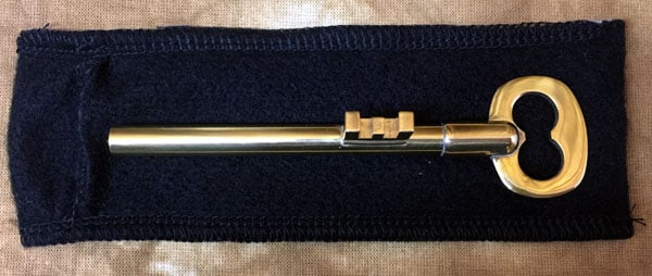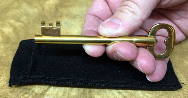 A large jailer's-type brass key is displayed at the fingertips. The bit which is used to move the tumblers in a lock is moved slowly around the shaft of the key. Then the bit is slid along the shaft. It can be made to stop anywhere along the shaft of the key. Finally, the key is handed out for examination. The bit is FIRMLY soldered in place next to the bow! No amount of examination will reveal the secret. Powerful MAGICK.