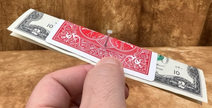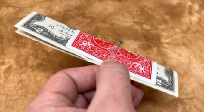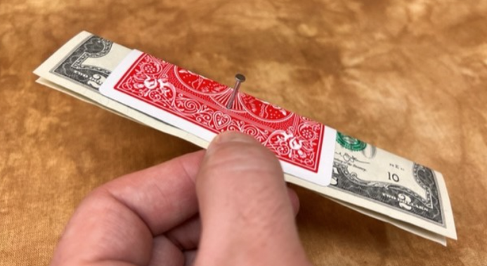 Effect: A dollar bill is folded inside a playing card and a toothpick is stuck through penetrating the card and the dollar. Now the toothpick has anchored both the card and the bill, they are locked together - right? Wrong! What happens next is uncanny - unbelievably, the bill is pulled back and forth! You actually "see" the bill moving back and forth, yet the toothpick (or nail) penetrates BOTH the bill and the card! At the end, the toothpick is removed, and then the card covering the bill and guess what? There are no tears, and no puncture marks! How can that be? This effect provides an additional option that will allow you to hand out the bill afterwards - if desired. No skill required. Complete with bill, cards, toothpicks, plastic wallet and exceptionally detailed routine and instructions by Michael Close, illustrations by Chris Kenner and Homer Liwag.