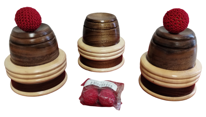This is a Deluxe Cups ‘N Balls set With Added Chop Cup, crated from brilliant hard wood Walnut and Maple, and hand-turned. Paul Lembo has created especially for us and our customers this extremely beautiful set of COMBO Cups ‘N Balls—one is a matching chop cup! This is the perfect matching set for those of you lucky enough to score one of the limited edition Shigeo Takagi one cup routine. Having both the Shiego Takagi one cup as well as this complete cups and ball set with chop cup, gives you ownership of something truly special and unique.