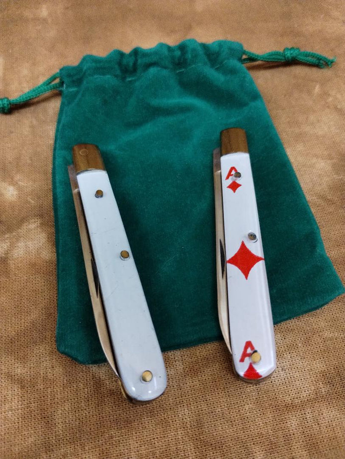 These Knives have Aces on top and White on the bottom. The knives use the Perfect Knife Clear Side Construction. I am sure you can come up with many new ideas using these knives. You can use these along with your card routines...or use in your standard 2 knife routine. Comes with written instructions for standard knife moves.